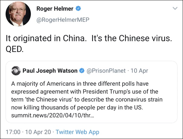赫爾默28日推文稱不要將病毒變種稱為“起源自英國(guó)”,但4月發(fā)布的下圖聲稱病毒“起源自中國(guó),就是中國(guó)病毒”。