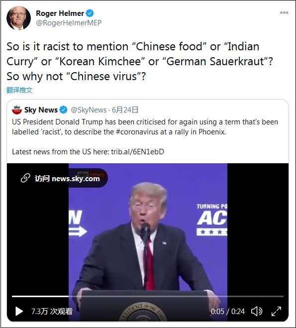 6月24日,赫爾默轉(zhuǎn)發(fā)了特朗普集會(huì)上喊“功夫病毒”的視頻,并評(píng)論稱:“說(shuō)中國(guó)菜、印度菜、韓國(guó)泡菜或德國(guó)酸菜是種族歧視嗎?那么,為什么‘中國(guó)病毒’(是呢)?”