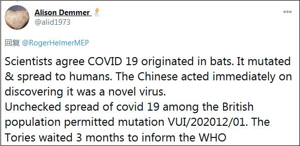 還有一名網(wǎng)友對(duì)比稱:“科學(xué)家同意新冠病毒起源自蝙蝠,變異后傳播給人類,中國(guó)人發(fā)現(xiàn)這是一種新病毒后,立即采取了行動(dòng)。新冠病毒在英國(guó)人口中無(wú)限制的傳播,導(dǎo)致了變異新冠病毒(VUI/202012/01),保守黨等了3個(gè)月才通知世衛(wèi)組織!