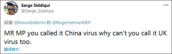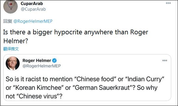 他在12月28日的一條推特中請(qǐng)求外界不要再將變異新冠病毒稱為“起源于英國(guó)”,而只是“在英國(guó)發(fā)現(xiàn)”。但這條推特徹底“翻車”,大量網(wǎng)民在評(píng)論中挖出赫爾默曾將新冠病毒污蔑為“中國(guó)病毒”的評(píng)論,指責(zé)他演繹“非常標(biāo)準(zhǔn)的雙重標(biāo)準(zhǔn)”。
