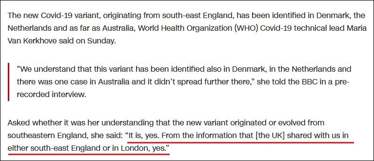 12月20日,世衛(wèi)組織緊急項(xiàng)目技術(shù)主管瑪麗亞·范·克爾科夫(Maria Van Kerkhove)曾在采訪中被問(wèn)及變異病毒是否起源或在英國(guó)東南部進(jìn)化的問(wèn)題,她回答說(shuō):“是的。從英國(guó)和我們分享的信息來(lái)看,要么是在英國(guó)東南部,要么是在倫敦。是的!