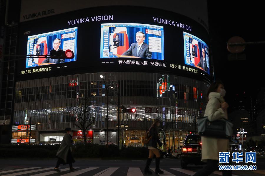 1月7日,在日本東京,戴口罩的行人經(jīng)過一處電子屏幕下方,屏幕上播放日本首相菅義偉宣布部分地區(qū)實行緊急狀態(tài)的新聞。新華社記者 杜瀟逸 攝
