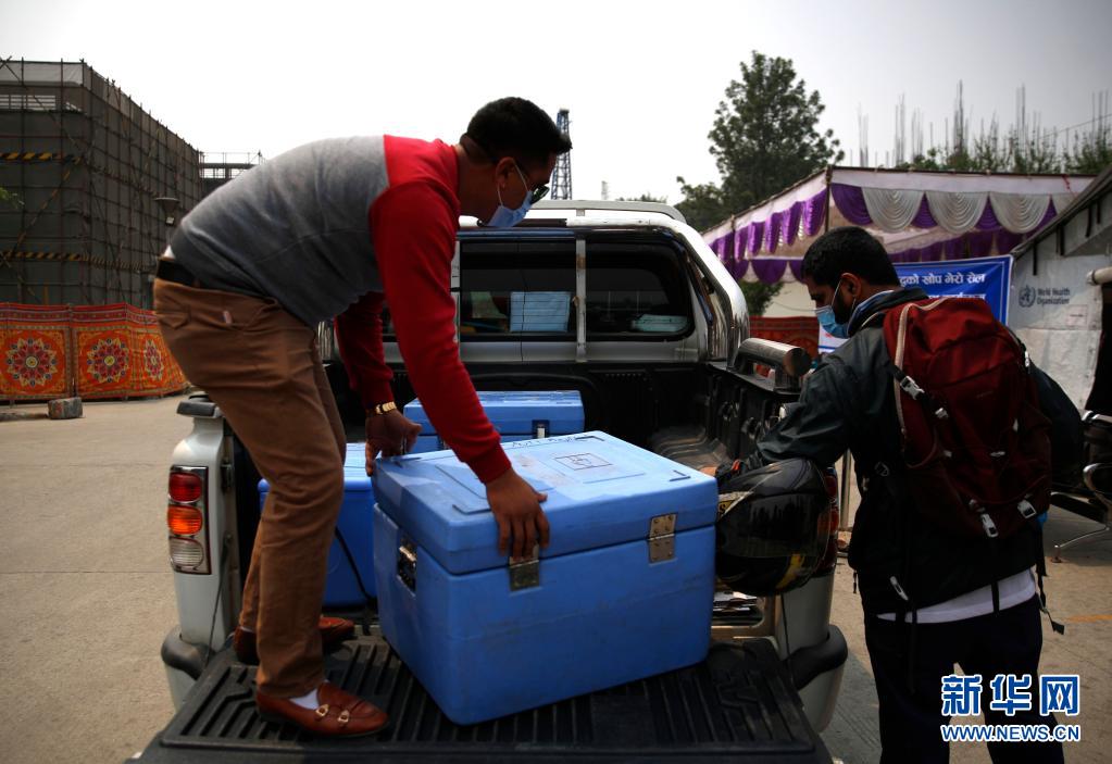 4月7日,在尼泊爾加德滿都一家醫(yī)院,工作人員在轉(zhuǎn)運(yùn)新冠疫苗。新華社發(fā)(蘇拉韋·什雷斯塔 攝)