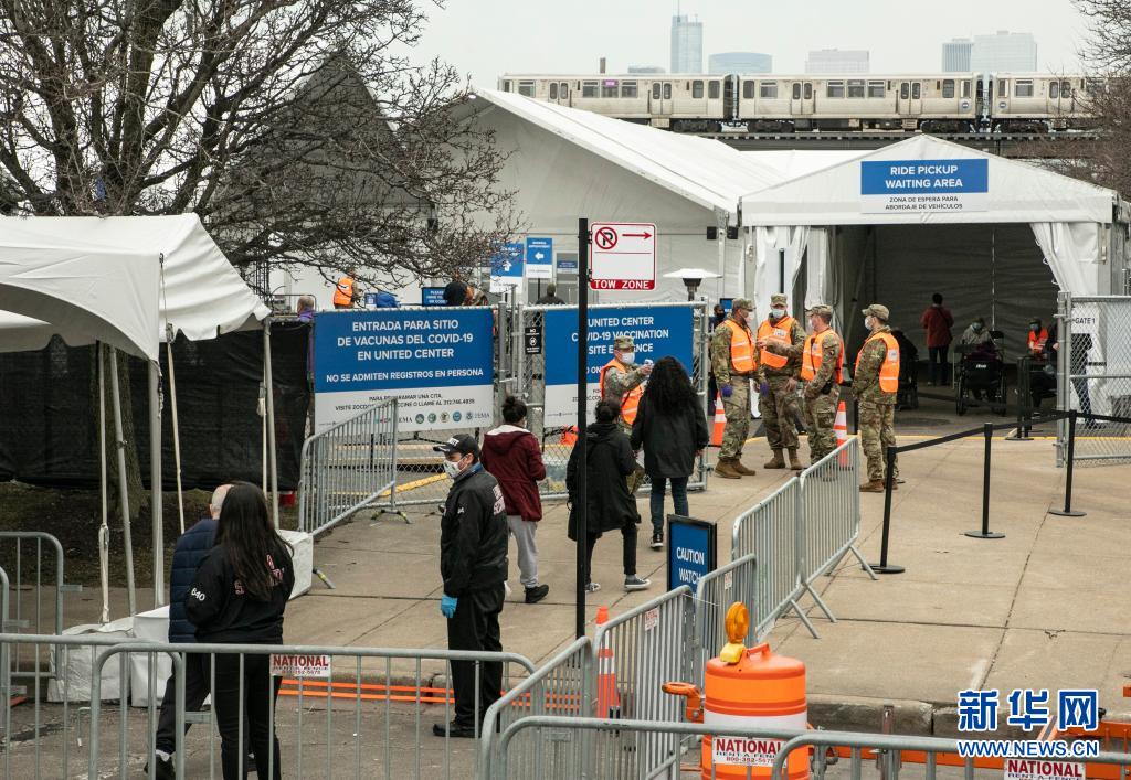 3月10日,在美國芝加哥,人們準(zhǔn)備進(jìn)入聯(lián)合中心球場新冠疫苗接種點。(新華社發(fā),喬爾·萊納攝)