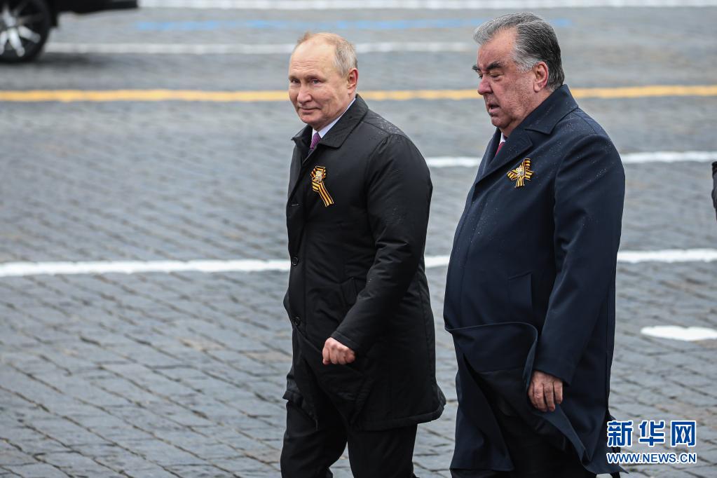 5月9日,在俄羅斯首都莫斯科,俄羅斯總統(tǒng)普京(左)和塔吉克斯坦總統(tǒng)拉赫蒙在閱兵式后走過紅場。新華社發(fā)(葉甫蓋尼·西尼岑攝)