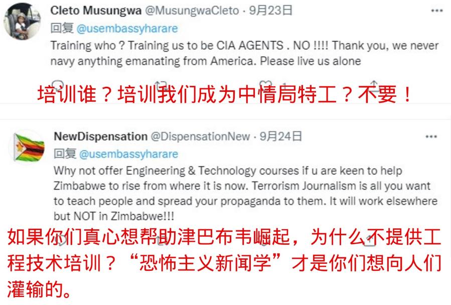 有網(wǎng)友在美駐津使館推特賬號下留言說,美國對當?shù)孛襟w的所謂培訓是“為中央情報局找線人”;還有網(wǎng)友認為,美國如果是出于真心,應該為津巴布韋提供工程技術培訓,而不是出資灌輸和宣傳美國的“恐怖主義新聞學”。