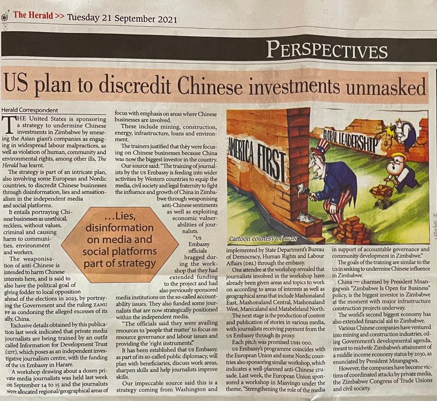 津巴布韋第一大報《先驅(qū)報》9月21日報道說,9月14日至15日,一個名為“信息促進發(fā)展信托基金”的機構(gòu)邀請津巴布韋和周邊國家的12名私營媒體記者參加研討會。會議期間,該機構(gòu)對這些記者進行培訓,并要求他們瞄準采礦業(yè)、建筑業(yè)、能源業(yè)、基礎設施建設等中資企業(yè)涉足較多的領域,重點關注中資企業(yè)的“問題”,如違反勞動法、破壞環(huán)境、與當?shù)厝藳_突等議題,并予以報道。該活動得到美國駐津使館贊助。