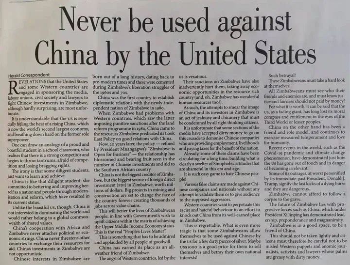 文章認為,公平正義沒有價格標簽,公平正義不需要用金錢收買。津人民應該擦亮雙眼,分清敵友,警惕被美國利用成為反華棋子。中國是進步的力量,堅定發(fā)展津中友誼與合作,是津巴布韋走向光明未來的正道。