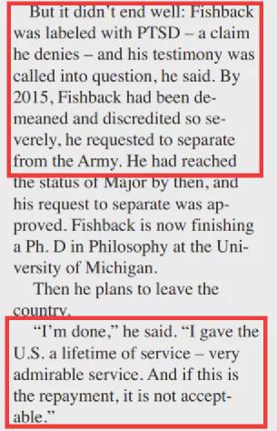 這位曾經(jīng)的美國“英雄”,還特別在報道中提到了他“被精神病”的事情,稱他被軍隊扣上了患有“創(chuàng)傷應(yīng)激綜合征”(PTSD)的帽子,盡管他堅持否認(rèn)這一情況。而這樣的侮辱和攻擊,令他的個人名聲被“嚴(yán)重”損害,迫使他不得不在2015年時離開了軍隊。