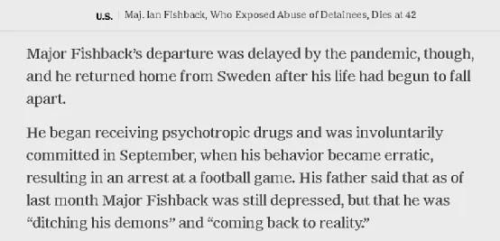 截圖來自《紐約時報》的報道,其中提到費舍拜克的家人稱他得了“精神病”并在“服藥”