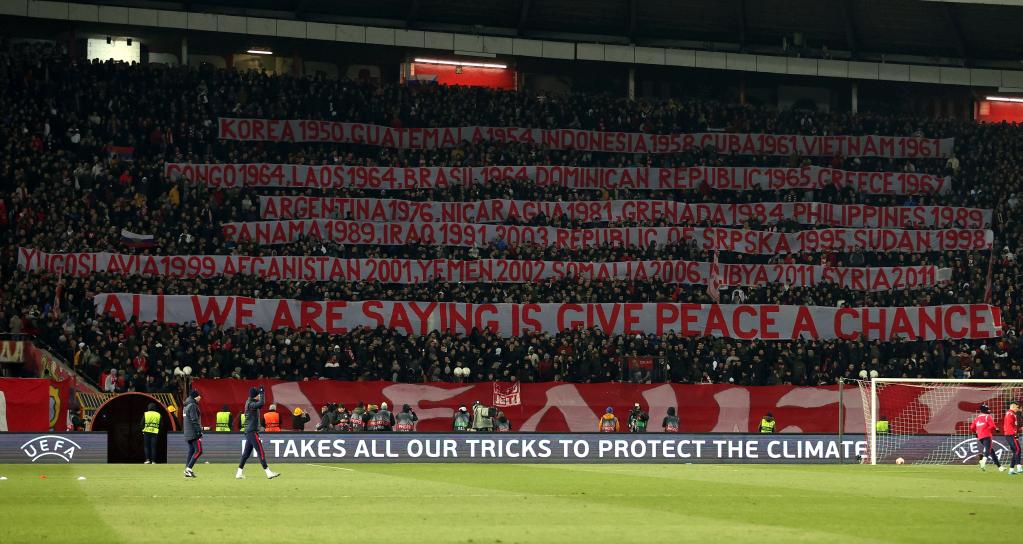 3月17日,在塞爾維亞首都貝爾格萊德舉行的一場足球比賽中,塞爾維亞觀眾拉起多條橫幅,細(xì)數(shù)美國、北約過去幾十年來轟炸或挑起戰(zhàn)爭的國家和地區(qū)名單,并高唱反戰(zhàn)歌曲,以此諷刺西方在“反戰(zhàn)”方面的雙重標(biāo)準(zhǔn)。新華社發(fā)(普雷德拉格·米洛薩夫列維奇攝)