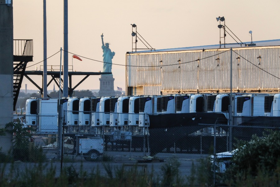 這是2021年9月6日在美國紐約布魯克林拍攝的一處臨時停尸場內(nèi)存放新冠患者遺體的冷藏車。新華社記者 王迎 攝