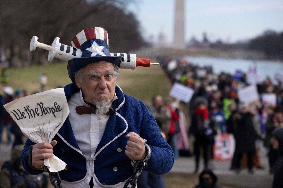 2022年1月23日,人們在美國首都華盛頓參加游行活動,反對新冠疫苗強制令等多種防疫措施。新華社發(fā)(阿倫攝)