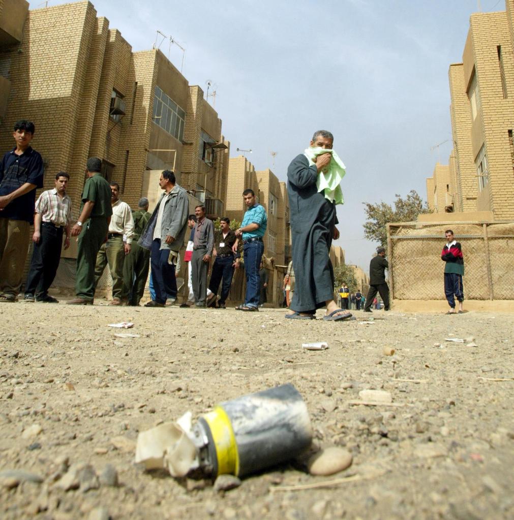 這是2003年4月5日在伊拉克巴格達(dá)南部一個(gè)居民區(qū)拍攝的照片,人們紛紛繞開一枚集束炸彈的“小炸彈”。新華社發(fā)