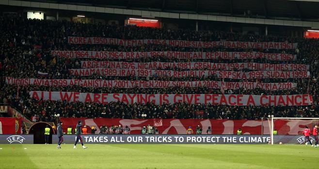 2022年3月17日,在塞爾維亞首都貝爾格萊德舉行的一場足球比賽中,塞爾維亞觀眾拉起多條橫幅,并高唱反戰(zhàn)歌曲,以此諷刺西方在“反戰(zhàn)”方面的雙重標準。新華社發(fā)(普雷德拉格·米洛薩夫列維奇攝)