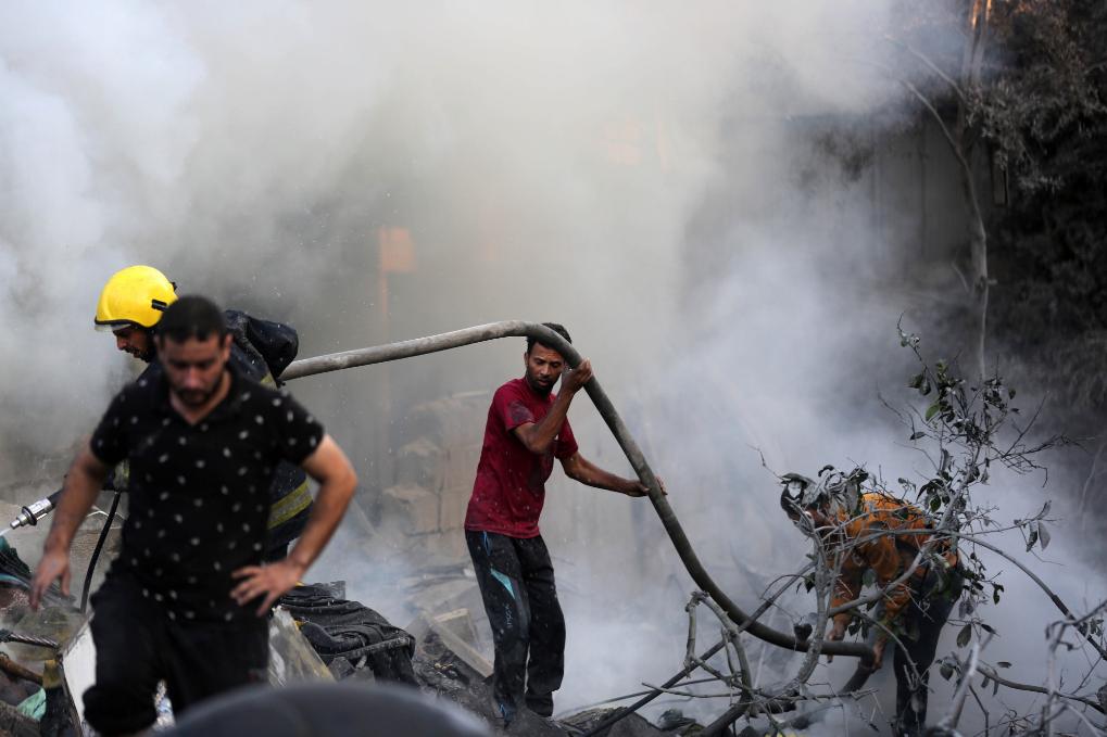 10月14日,在加沙地帶南部城市汗尤尼斯,人們在撲滅以色列空襲造成的火災(zāi)。新華社發(fā)(亞西爾·庫迪攝)
