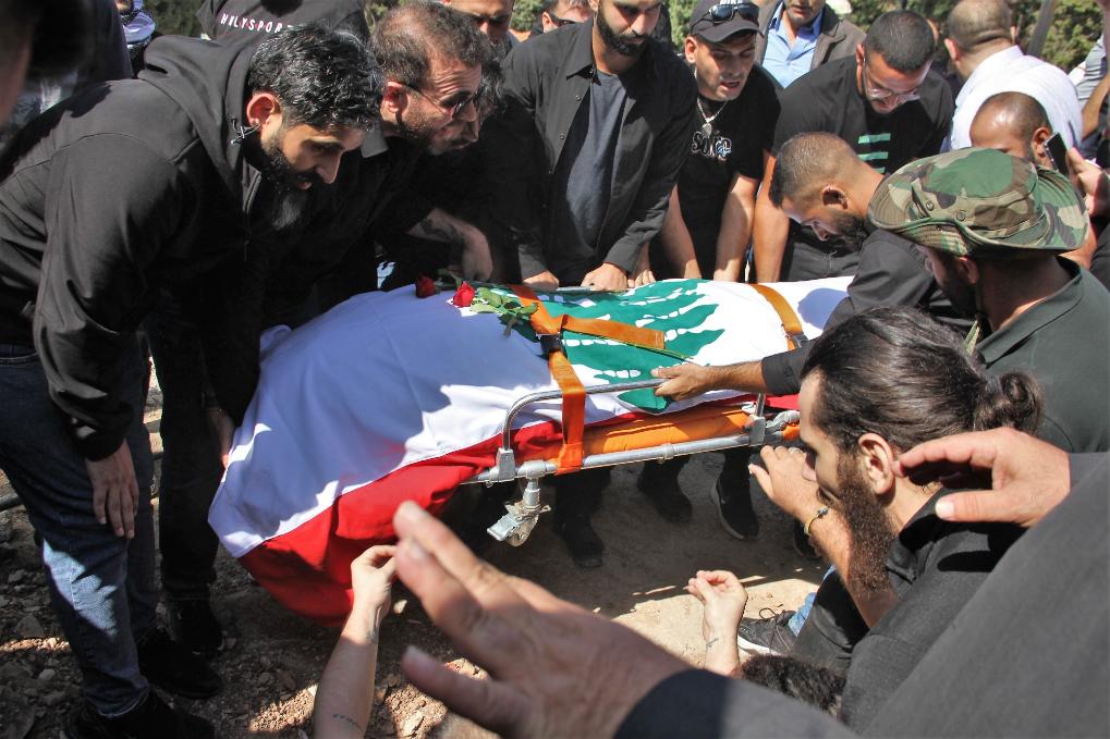 10月14日,黎巴嫩南部希亞姆鎮(zhèn),黎巴嫩記者和民眾為在以色列轟炸中死亡的攝影記者伊薩姆·阿卜杜拉送葬。新華社發(fā)(塔希爾·阿布·哈姆丹攝)