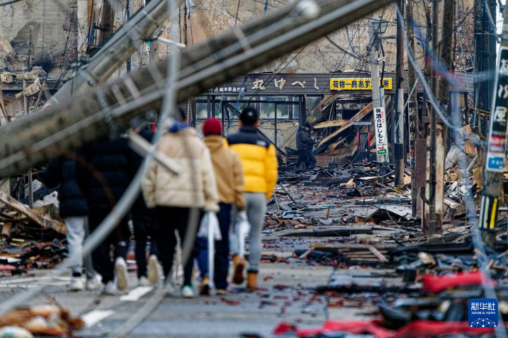 在日本石川縣輪島市,市民們查看“輪島早市”被地震引發(fā)的大火燒毀的廢墟(1月4日攝)。
