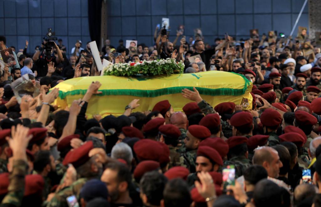 8月1日,在黎巴嫩首都貝魯特,真主黨支持者參加真主黨高級(jí)軍事指揮官福阿德·舒庫爾的葬禮。新華社發(fā)(比拉爾·賈維希攝)
