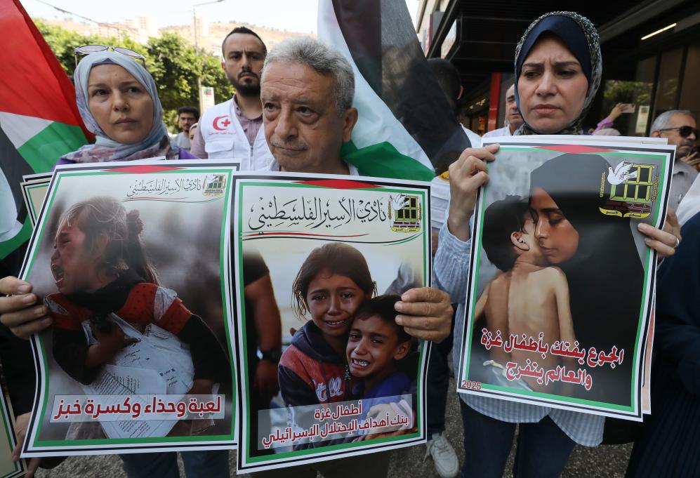7月29日,人們?cè)诩s旦河西岸城市納布盧斯集會(huì),抗議以色列對(duì)加沙實(shí)施的饑餓政策,呼吁;鹬箲(zhàn)。新華社發(fā)(尼達(dá)爾·艾仕塔耶?dāng)z)
