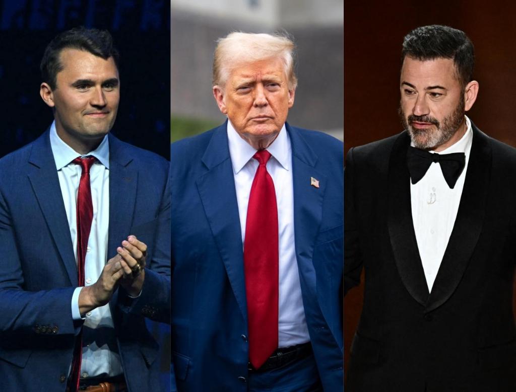 拼版圖片,美國知名保守派活動人士查理·柯克(左)、美國總統(tǒng)特朗普(中)、美國《吉米·基梅爾秀》主持人基梅爾(右)。