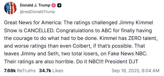 特朗普17日在社交媒體平臺“真實社交”上對ABC的停播決定表示肯定:“這對美國來說是個好消息。祝賀ABC終于鼓起勇氣做了該做的事”。他同時抨擊美國全國廣播公司(NBC)脫口秀節(jié)目主持人吉米·法倫和塞思·邁耶斯。