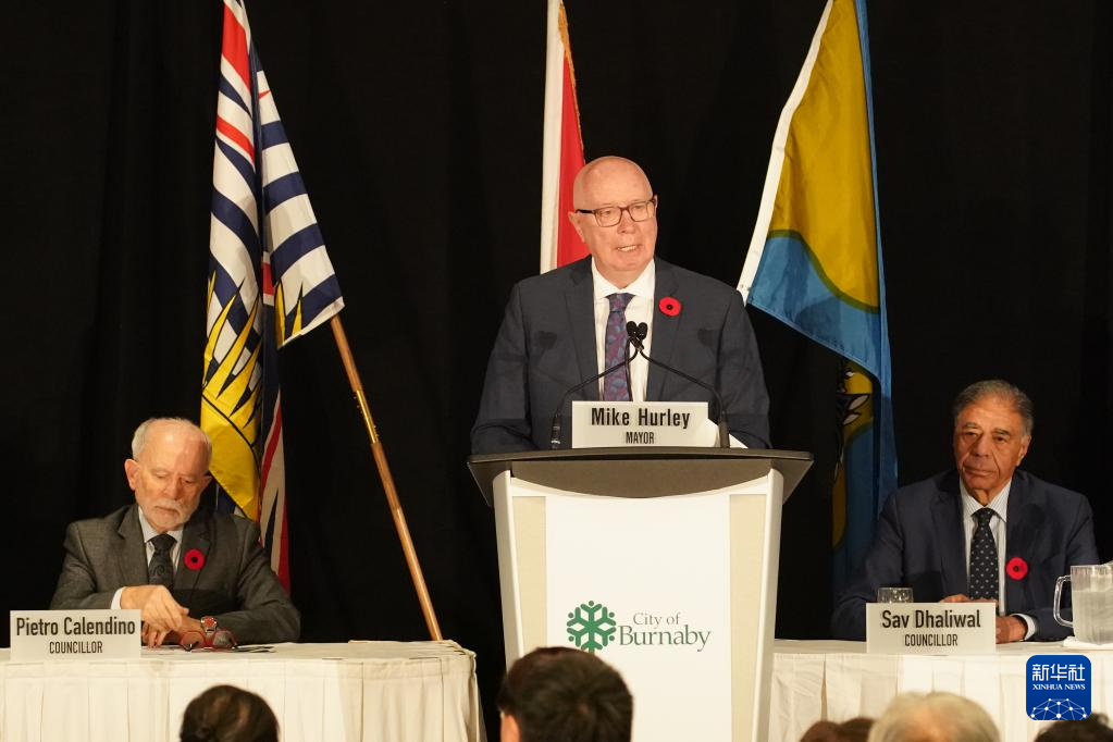 11月15日,在加拿大伯納比市,伯納比市市長赫爾利代表市政府宣讀聲明。新華社發(fā)(萬斌攝)