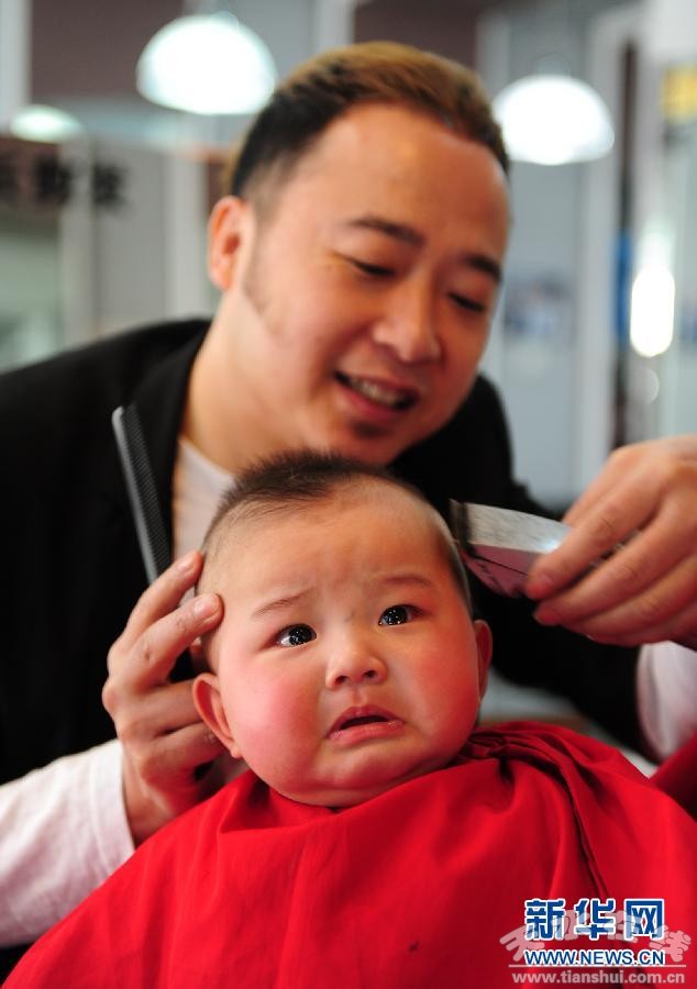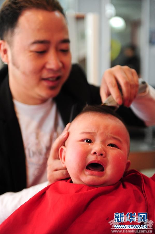 3月13日,在山東省煙臺(tái)市一家理發(fā)店,理發(fā)師為出生5個(gè)月的小朋友曲泳豪“剃龍頭”。當(dāng)日是農(nóng)歷二月初二,我國民間有“二月二,剃龍頭”的傳統(tǒng)習(xí)俗。人們?cè)谶@天剃頭,期盼新年新氣象,交上好運(yùn)氣。新華社發(fā)(初陽 攝)