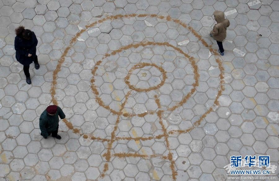 3日12日,山東省聊城市莘縣古云鎮(zhèn)徐莊村,一戶農(nóng)家在圍好的“糧倉(cāng)”周圍走圈。我國(guó)北方許多地區(qū)流傳著“二月二,龍?zhí)ь^,大倉(cāng)滿,小倉(cāng)流”的民諺,當(dāng)?shù)剞r(nóng)民每年“二月二”都有“圍倉(cāng)”的傳統(tǒng),他們?cè)谧约以鹤踊虼箝T前用土或草木灰畫圈做“糧倉(cāng)”,大圈套小圈,再畫上“倉(cāng)”的梯子,最里面的小圈里放上一把五谷雜糧,寓意來(lái)年五谷豐登! ⌒氯A社發(fā)(張憲舉 攝) |