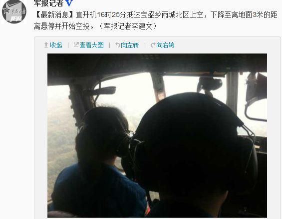 軍報記者:[最新消息]直升機16時25分抵達寶盛鄉(xiāng)雨城北區(qū)上空,下降至離地面3米的距離懸停并開始空投。