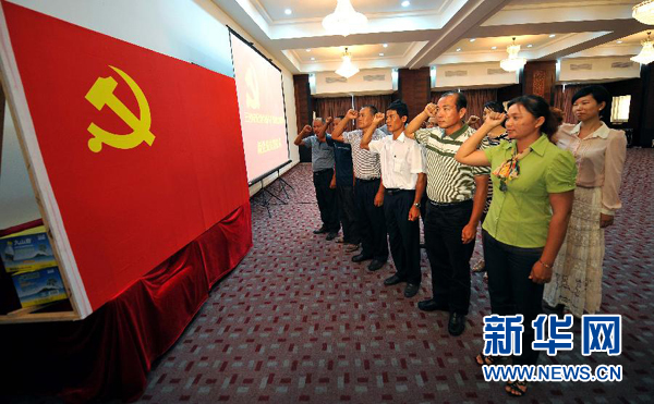 6月28日,三沙市11名新黨員在黨旗下宣誓。 新華社記者 郭程 攝