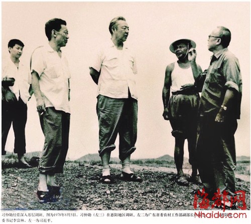 中共黨史出版社近日出版了《習(xí)仲勛畫冊》,畫冊圖文并茂,其中許多照片為首次公開展示。畫冊中提到,習(xí)仲勛經(jīng)常深入基層調(diào)研。圖為1978年8月5日,習(xí)仲勛(左三)在惠陽地區(qū)調(diào)研。左二為廣東省委農(nóng)村工作部副部長杜瑞芝,右一為惠陽地委書記李富林,左一為習(xí)近平。