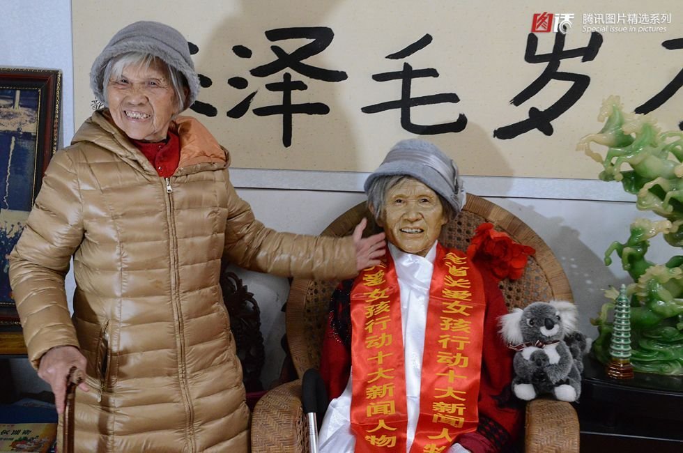 83歲的湯瑞仁是韶山?jīng)_的名人,她創(chuàng)辦的毛家飯店在國(guó)內(nèi)開了許多家連鎖店。1959年湯瑞仁與毛澤東的一張合影改變了她的人生。她曾因客人言語(yǔ)間對(duì)毛澤東不敬而將一桌子飯菜掀翻。如今,她的客廳里,一尊帶電光效果的金元寶,巨大,顯眼。圖為12月5日,湯瑞仁撫摸著她本人的蠟像留影,墻上的“萬(wàn)歲毛澤東”是她的親筆墨寶。