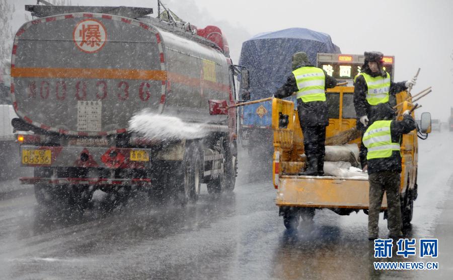 2月18日,江西昌九高速沙河收費所工作人員對路面進行融雪作業(yè)。當(dāng)日,我國南方多地迎來新一輪雨雪天氣,江蘇、浙江等多省發(fā)布暴雪預(yù)警。 新華社發(fā)(楊風(fēng)勝 攝)