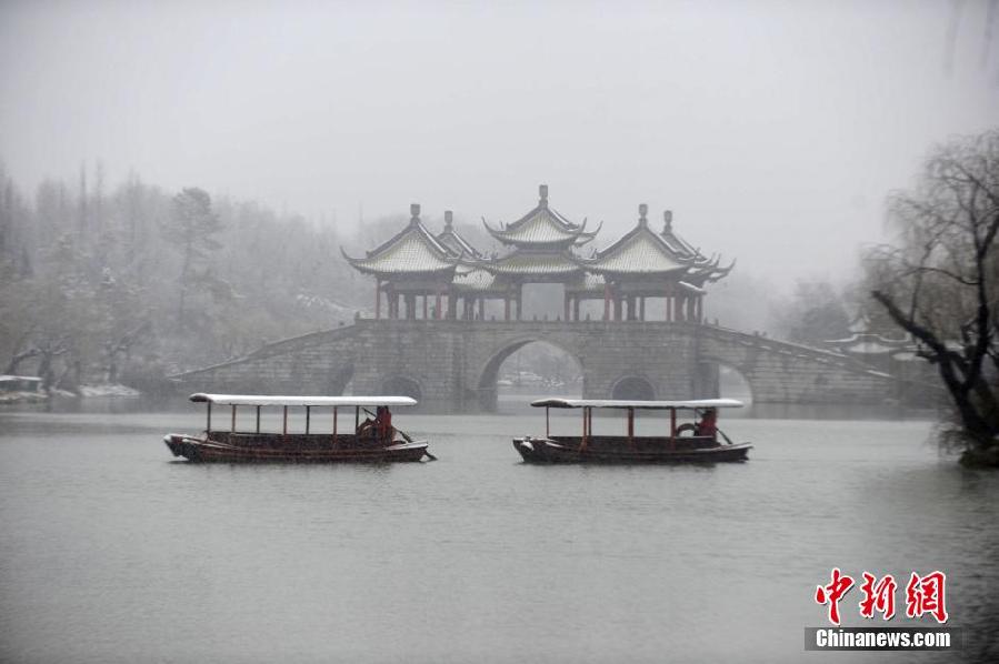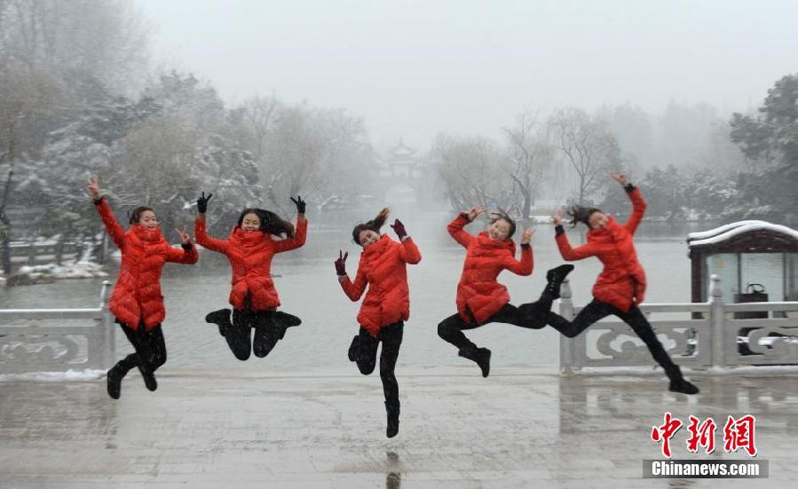 2月18日,江蘇揚州大雪紛飛,頗具江南韻味的揚州古典園林瘦西湖景區(qū)銀裝素裹、如詩如畫,呈現(xiàn)出一派“北國風(fēng)光”,吸引了不少市民和游客走出戶外,感受春雪帶來的快樂。圖為幾名揚州瘦西湖的導(dǎo)游正在雪中開心的嬉戲。孟德龍 攝