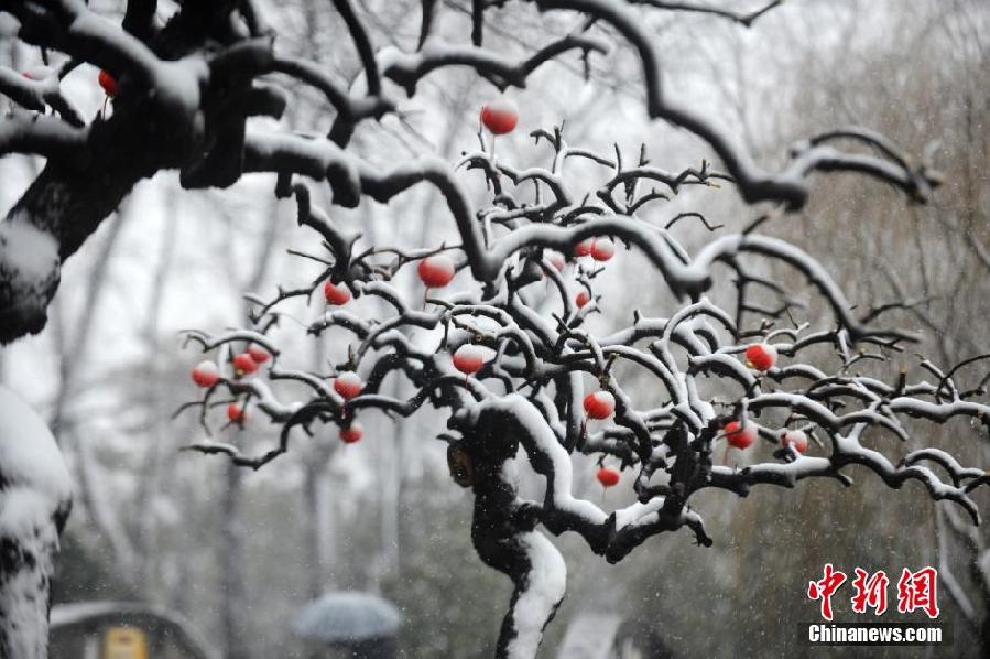 2月18日,江蘇揚州大雪紛飛,頗具江南韻味的揚州古典園林瘦西湖景區(qū)銀裝素裹、如詩如畫,呈現(xiàn)出一派“北國風(fēng)光”,吸引了不少市民和游客走出戶外,感受春雪帶來的快樂。圖為樹上懸掛的紅燈籠被白雪覆蓋。孟德龍 攝
