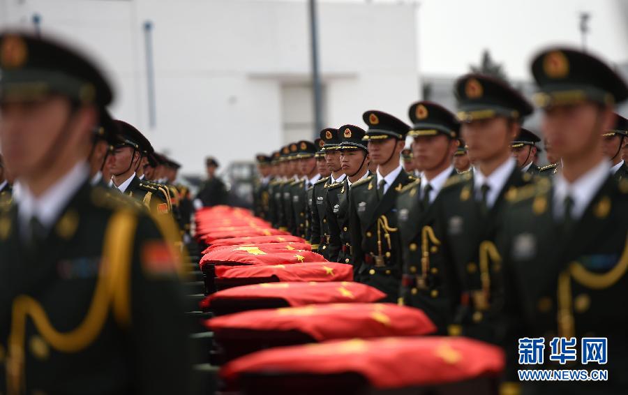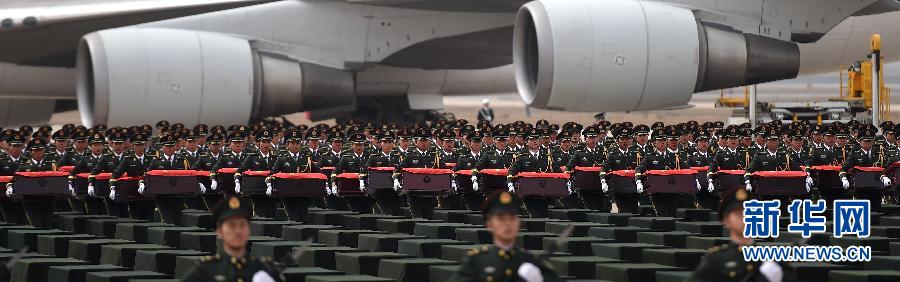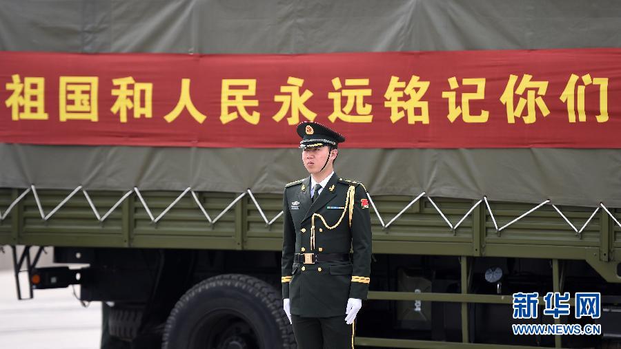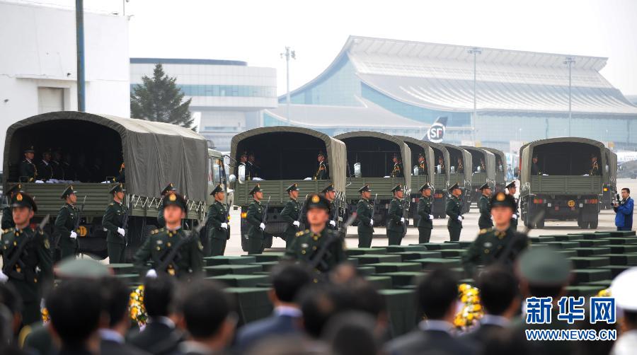 3月28日上午,禮兵護(hù)送志愿軍烈士遺骸棺槨至棺槨擺放區(qū)。當(dāng)日,搭載437具中國人民志愿軍烈士遺骸的專機(jī)降落在沈陽桃仙國際機(jī)場,離開祖國60多年的烈士英靈回家。 新華社記者 李鋼 攝