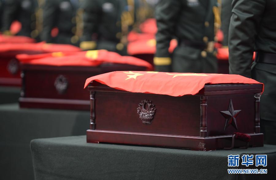 這是3月28日拍攝的志愿軍烈士遺骸棺槨。當(dāng)日,搭載437具中國人民志愿軍烈士遺骸的專機(jī)降落在沈陽桃仙國際機(jī)場,離開祖國60多年的烈士英靈回家。 新華社記者 潘昱龍 攝