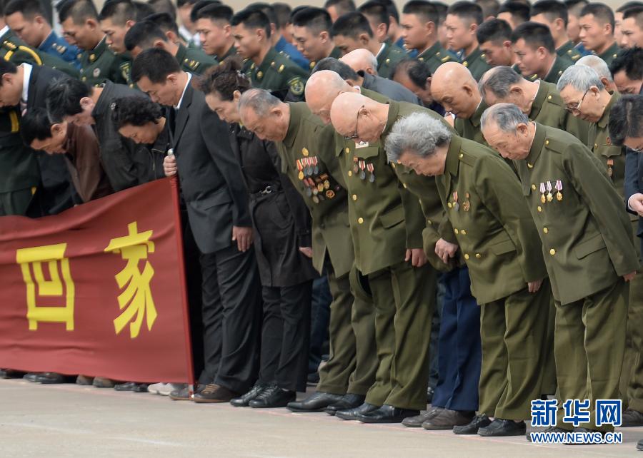 3月28日,志愿軍老兵向志愿軍烈士鞠躬。當(dāng)日,搭載437具中國人民志愿軍烈士遺骸的專機(jī)降落在沈陽桃仙國際機(jī)場,離開祖國60多年的烈士英靈回家。 新華社記者 潘昱龍 攝