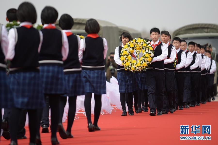 3月28日,少先隊員向志愿軍烈士敬獻(xiàn)花圈。當(dāng)日,搭載437具中國人民志愿軍烈士遺骸的專機(jī)降落在沈陽桃仙國際機(jī)場,離開祖國60多年的烈士英靈回家。 新華社記者 潘昱龍 攝