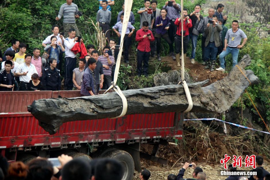 4月16日,江西武寧縣政府組織專(zhuān)業(yè)人員和機(jī)械在該縣船灘鄉(xiāng)船灘村對(duì)“千年烏木”進(jìn)行開(kāi)挖,使千年古木得以重見(jiàn)天日。挖掘現(xiàn)場(chǎng),聞?dòng)嵍鴣?lái)的附近數(shù)千名村民紛紛趕到現(xiàn)場(chǎng)圍觀,想一睹千年烏木“真容”。經(jīng)過(guò)數(shù)個(gè)小時(shí)的挖掘,現(xiàn)場(chǎng)共挖出“一長(zhǎng)三短”共4段烏木,其中最長(zhǎng)的一段烏木長(zhǎng)10余米,直徑約60厘米,3段短的烏木分別長(zhǎng)約2到4米,直徑20到60厘米不等。圖為被起吊機(jī)吊起的烏木。魏東升 攝