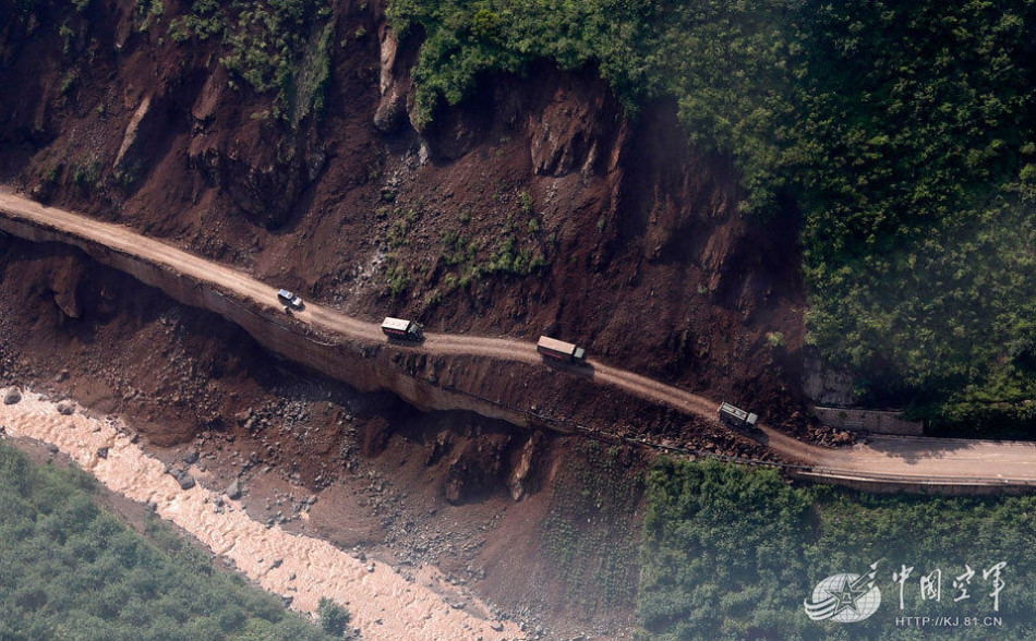 空軍航拍云南震區(qū) 軍車在危路上艱難前進(圖)
