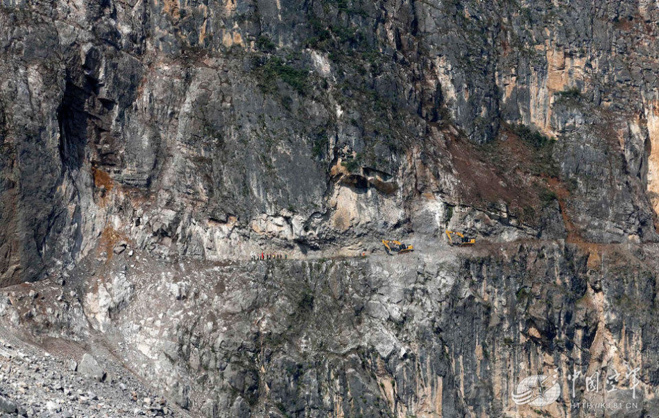 救援人員在牛欄江峽谷全力搶修通往堰塞湖的道路。