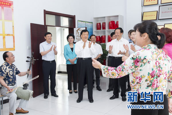 這是7月10日,劉云山在石嘴山市東勝社區(qū)群眾文化室看望正在排練的群眾。新華社記者王曄攝