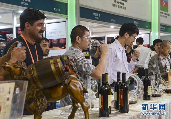 在第三屆中國—亞歐博覽會(huì)上,參觀者在格魯吉亞展區(qū)品嘗紅酒(2013年9月3日攝)。