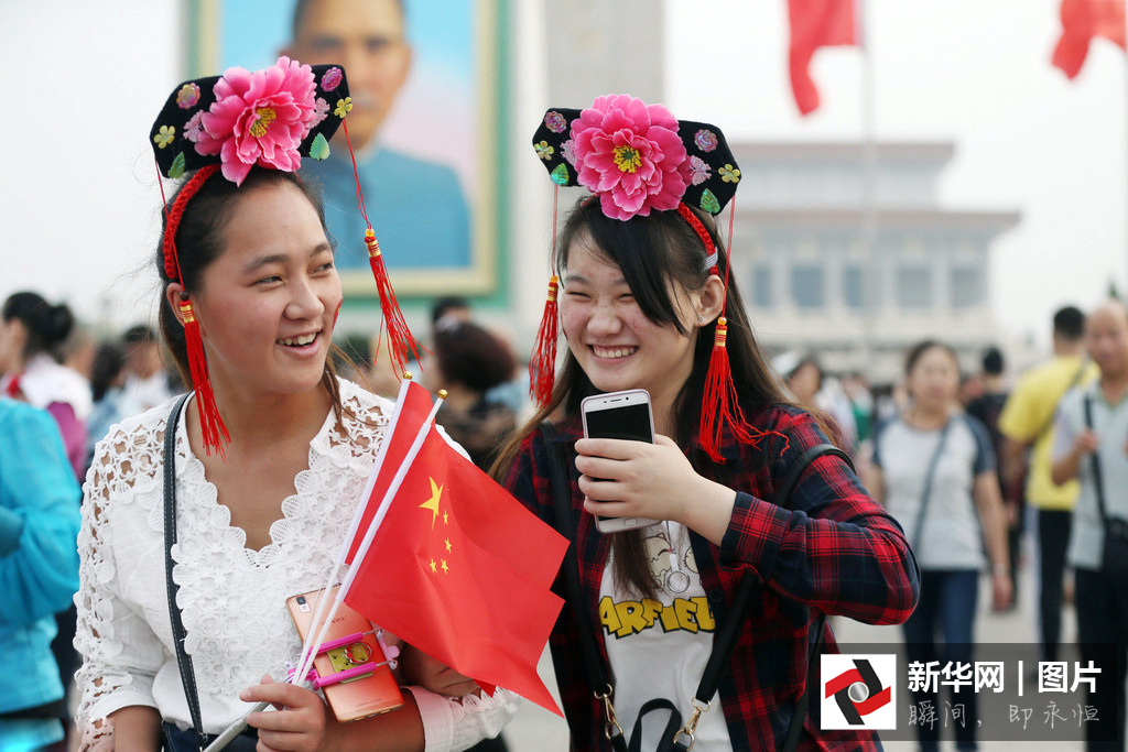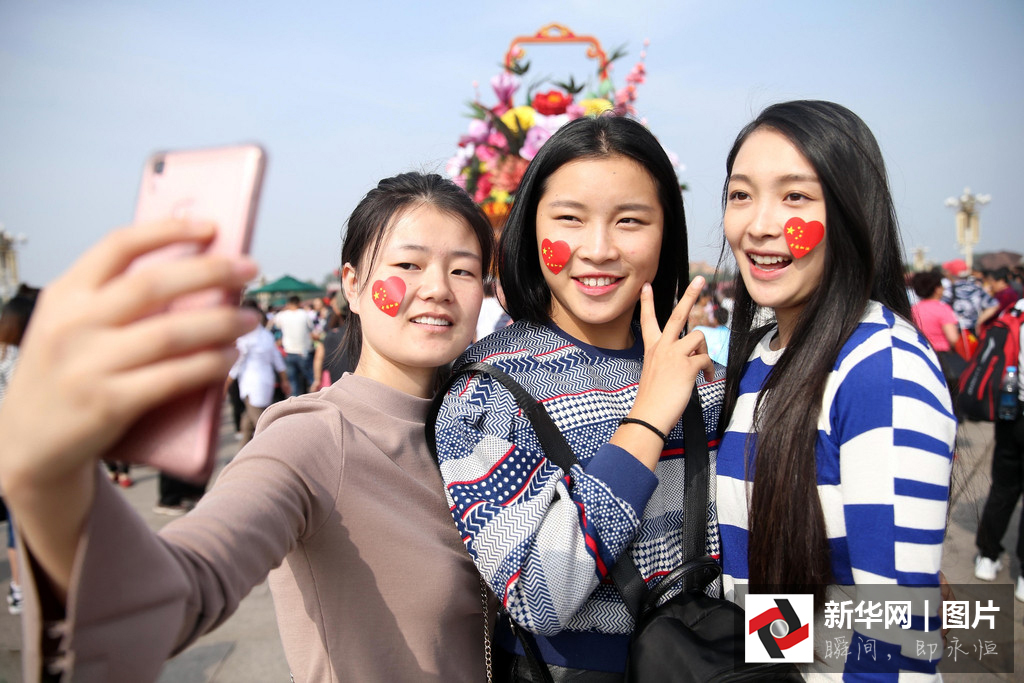 2016年10月6日,女孩在北京天安門廣場巨型花籃前自拍。景區(qū)里、街道上,到處都有手拿紅色小國旗的市民及游人,有的還貼臉上,在這紅色的海洋中,一張張笑臉燦若晨曦,讓人沉醉。