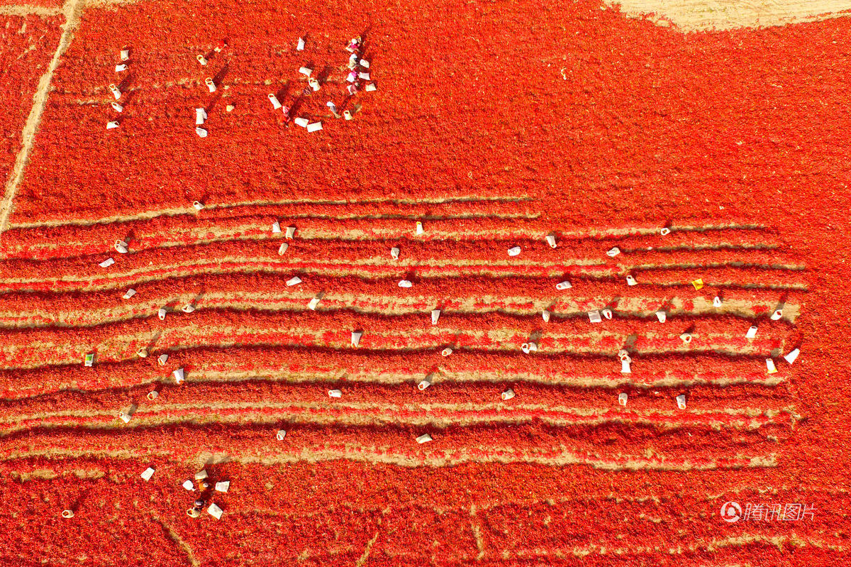 10月10日,在新疆博湖縣烏蘭再格森鄉(xiāng)烏蘭再格森村的晾曬場上,椒農(nóng)正在對豐收的辣椒進(jìn)行集中晾曬、分揀、裝袋。每年深秋時(shí)節(jié),素有“辣椒之鄉(xiāng)”新疆博湖縣又迎來了一個(gè)滿滿豐收季,火紅的辣椒鋪滿了整個(gè)晾曬場,在一望無際的金秋田野上顯得十分耀眼。年磊/視覺中國