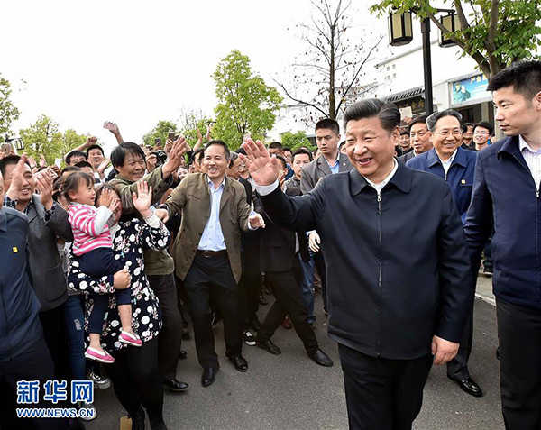 2016年4月24日至27日,習(xí)近平在安徽調(diào)研。這是4月25日下午,習(xí)近平在滁州市鳳陽縣小崗村向村民們問好。 新華社記者 李濤 攝