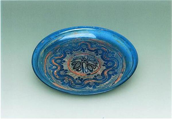 盤(pán)口細(xì)頸貼塑淡黃色琉璃瓶和羅馬丹芭紋描金藍(lán)色琉璃盤(pán),就是其中的兩件。
