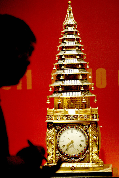這是銅鍍金嵌料石升降塔鐘。塔座上立九層六角塔,每層均飾欄板,塔檐有六條珠鏈。弦滿(mǎn)開(kāi)動(dòng)后,隨著中國(guó)民樂(lè)《茉莉花》的旋律,塔身緩緩升起,而后又平穩(wěn)降落,曲終,塔恢復(fù)原狀。